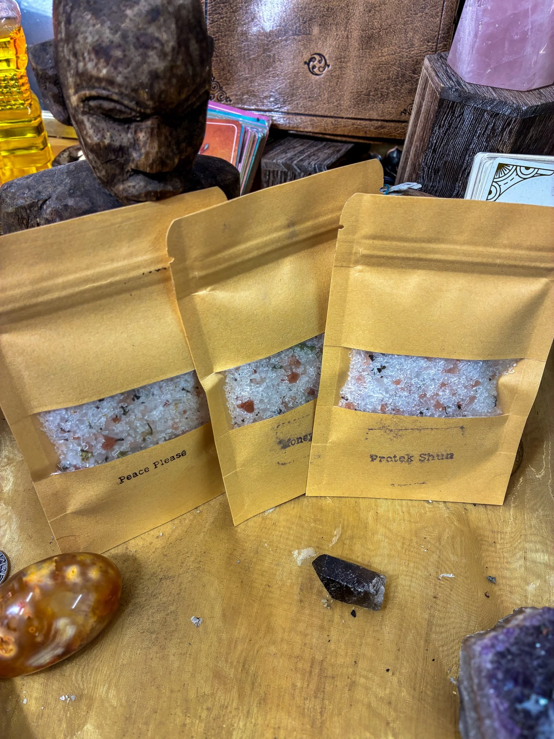 Each salt blend is rooted in Yoruba spiritual practice and crafted from my research, prayer, and focused asé. This bundle is perfect if you want to create a monthly cycle of cleansing, calming, and calling-in, or if you simply want to keep your spiritual tools stocked and ready.