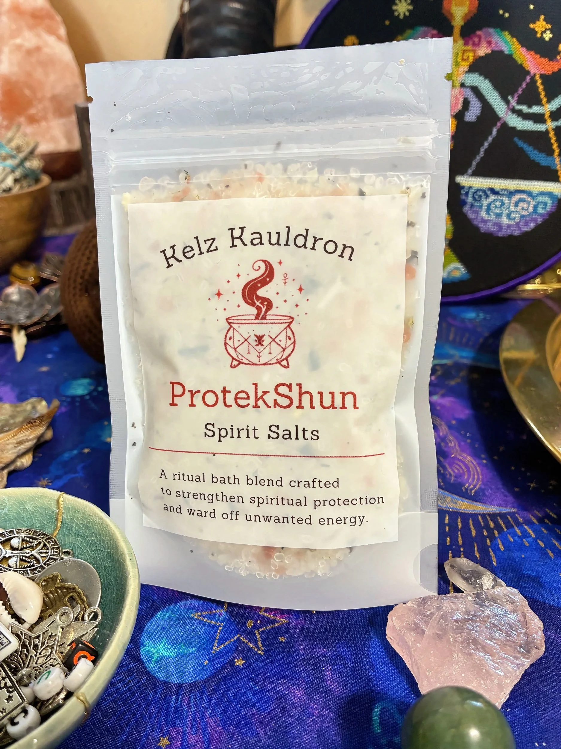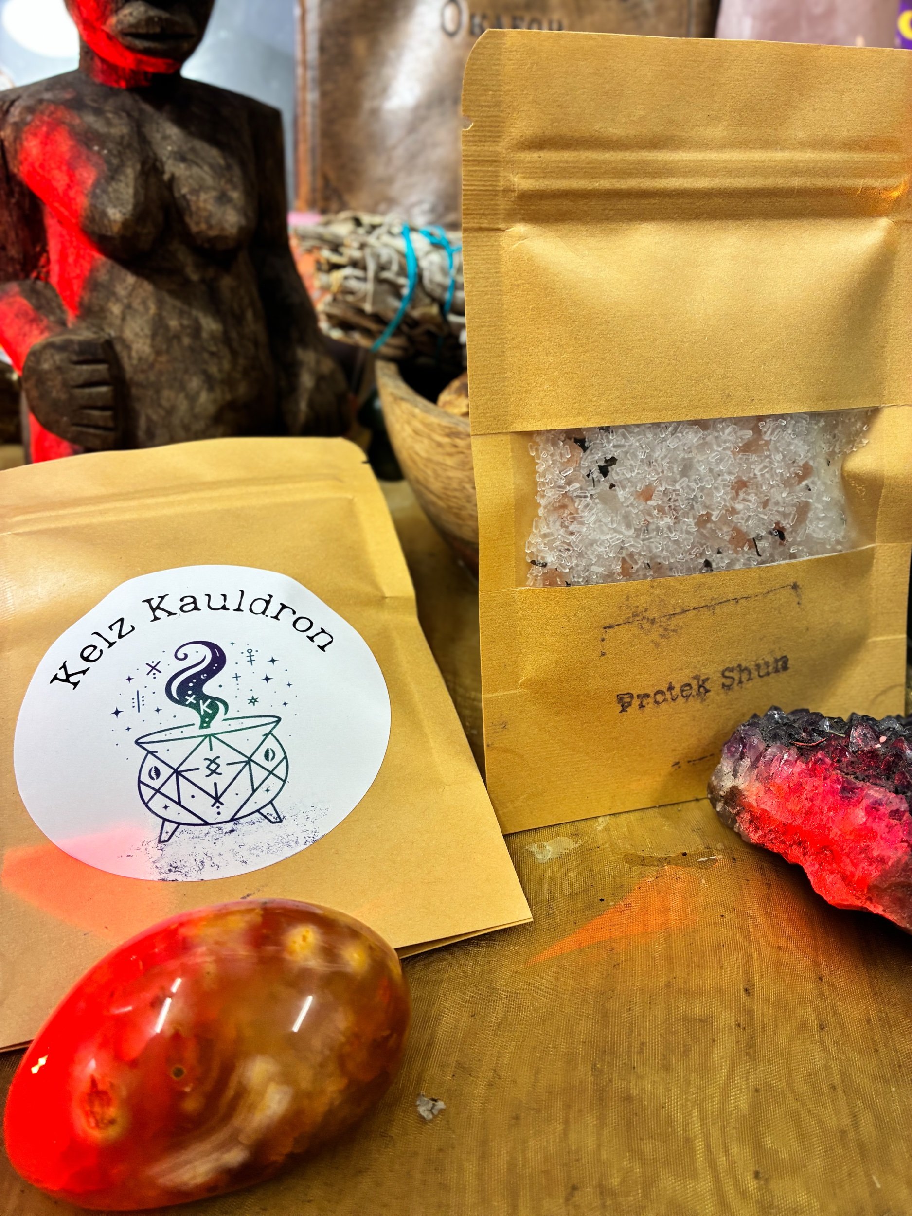 ProtekShun (protection) is one of the blend of bath salts I’ve created, rooted in Yoruba spiritual practice and the ancestral wisdom of cleansing, grounding, and shielding one’s ori. I crafted this recipe after a deep amount of study, research, and refinement. Focusing on drawing from traditional methods of spiritual protection and the elemental power of salt, herbs, and prayer.